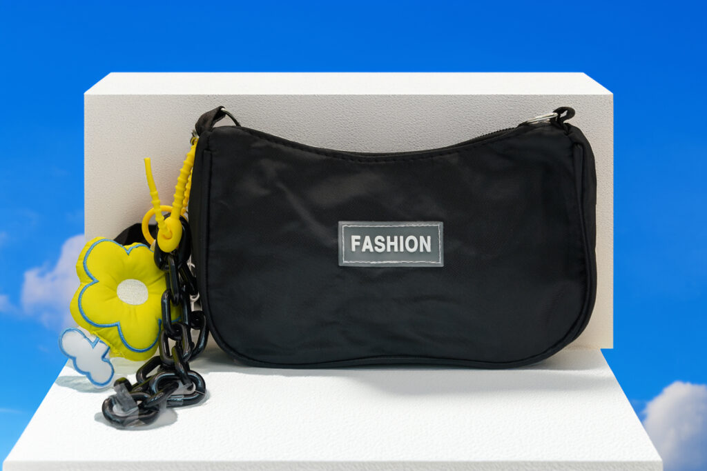 กระเป๋าใบนี้มีดีไซน์ที่เรียบหรู ทำจากหนังคุณภาพดีด้วยสีดำคลาสสิค ตัวกระเป๋ามีรูปทรงสี่เหลี่ยมพร้อมซิปที่ด้านบน ซึ่งให้ความรู้สึกหรูหราและมีระดับ ด้านหน้าของกระเป๋ามีป้ายสีเทาที่เขียนคำว่า “FASHION” ด้วยตัวอักษรสีขาว เพิ่มความเด่นชัดและน่าสนใจ